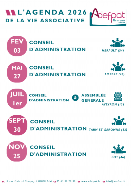 L’agenda de la vie associative 2026 de l’Adefpat est sorti ! Retrouvez ici toutes les dates et les lieux des conseils d’adm ...